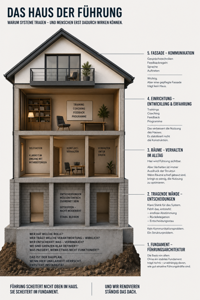 Führung scheitert nicht oben im Haus. Sie scheitert im Fundament. Und wir renovieren ständig das Dach.